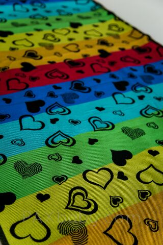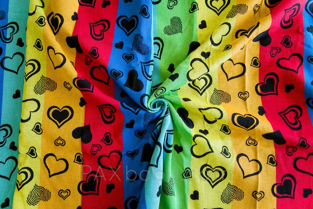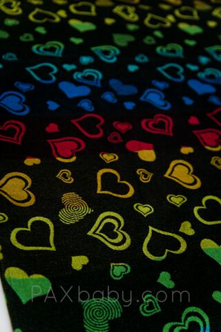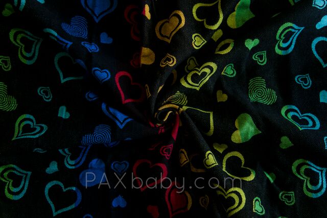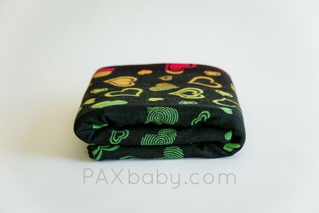 Last year, you fell in love with PAXbaby’s KoKaDi exclusive woven wrap, Love In Your Heart. Woven with a cream weft, I called this adorable wrap girlie, and today marks the return of LIYH but with a new look! Our weft this time around is a midnight black, and it’s official name is dude! Wear your baby OR toddler in this supportive wrap and enjoy the vivacious colors that LIYH has to offer! A totally reversible design, one side shows more bold stripes and the other shows off better the bright hearts! 100% cotton, woven in Germany, and sold ONLY at PAXbaby.com, Love In Your Heart is one of our best selling exclusive designs!!!!