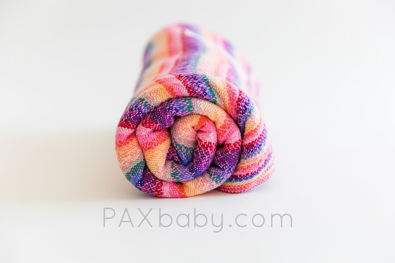 Trailing Rainbows is PAXbaby’s very first exclusive handwoven wrap created by LJ Handwovens! Laura is a color genius, and designed this palette to suit our PAXpersonality! This vibrant warp with a variety of fun wefts woven on her famous pink flower warp gives each wrap an amazing amount of diagonal stretch while maintaining support for the older and heavier baby! Our PAXexclusive LJ Handwoven wrap is named Trailing Rainbows; the pattern starts with a single strand creating a rainbow and slowly increasing throughout the warp creating one rainbow selvedge edge while the other is a solid color which helps the new wrapper be more aware of twisting. Trailing Rainbows is a cotton warp with cotton weft chosen for its ease of care. Wash, dry, and wear! It’s THAT easy!