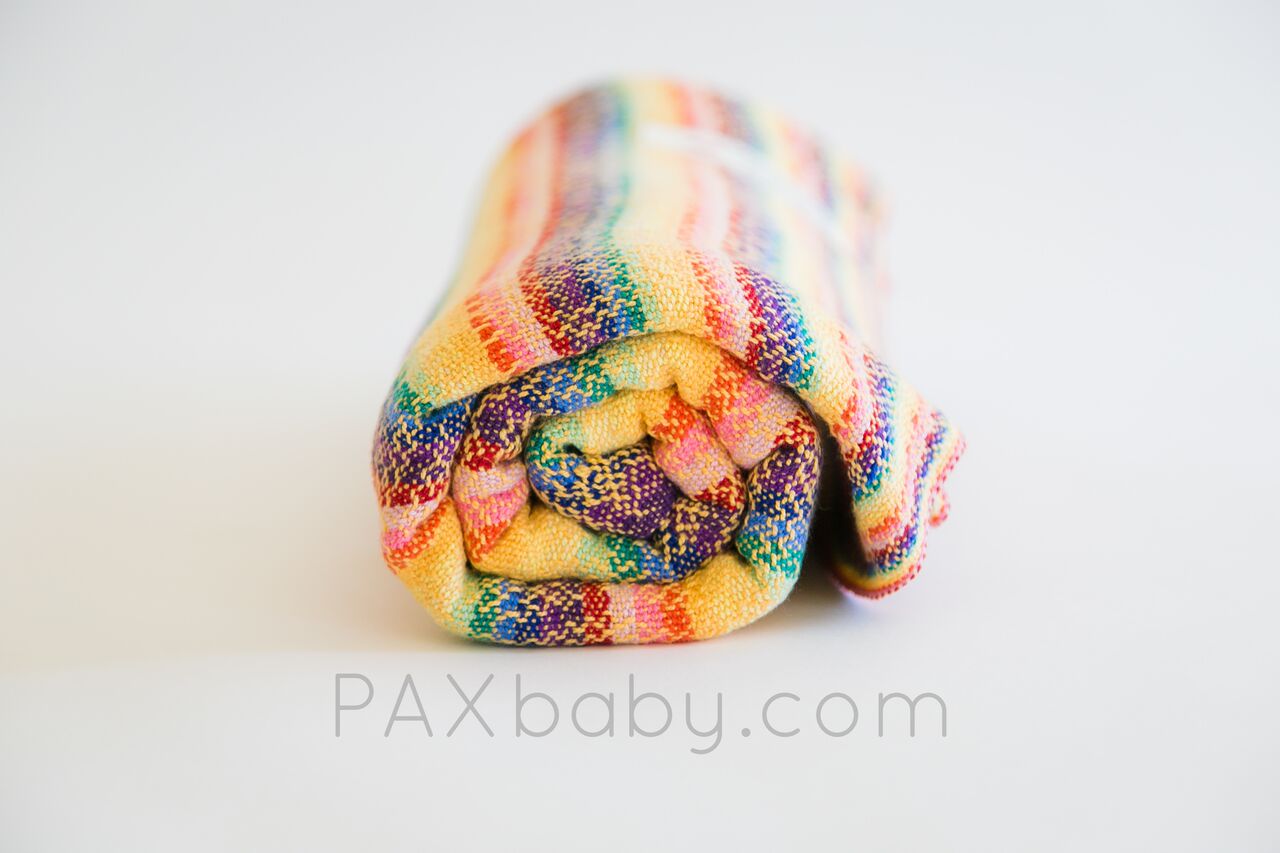 Trailing Rainbows is PAXbaby’s very first exclusive handwoven wrap created by LJ Handwovens! Laura is a color genius, and designed this palette to suit our PAXpersonality! This vibrant warp with a variety of fun wefts woven on her famous pink flower warp gives each wrap an amazing amount of diagonal stretch while maintaining support for the older and heavier baby! Our PAXexclusive LJ Handwoven wrap is named Trailing Rainbows; the pattern starts with a single strand creating a rainbow and slowly increasing throughout the warp creating one rainbow selvedge edge while the other is a solid color which helps the new wrapper be more aware of twisting. Trailing Rainbows is a cotton warp with cotton weft chosen for its ease of care. Wash, dry, and wear! It’s THAT easy!