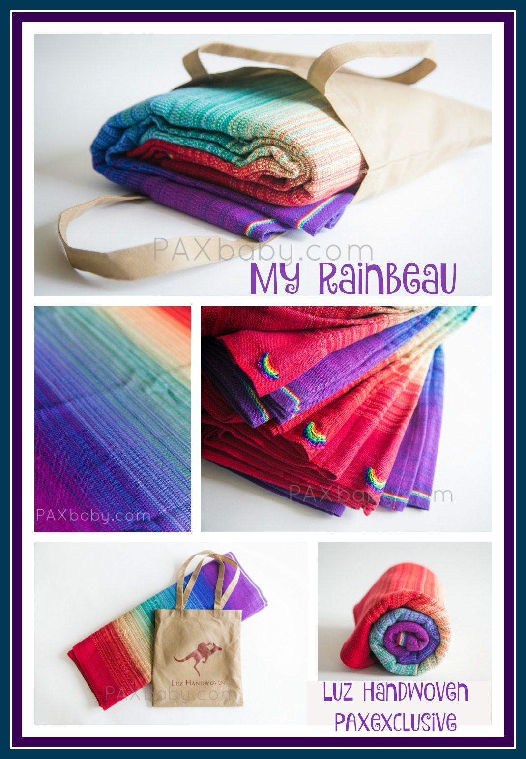 A very sweet & very amazing artist wove, by hand, a collection of gorgeous wraps JUST for us! Sarah from LUZ Handwovens created for PAXbaby the most beautiful handwoven rainbow complete with teaching rails and a hand stitched rainbow middle marker! Woven in the USA and made with 100% cotton, be sure to make ‘My Rainbeau’ your FIRST handwoven! It doesn’t get more special than this!!!