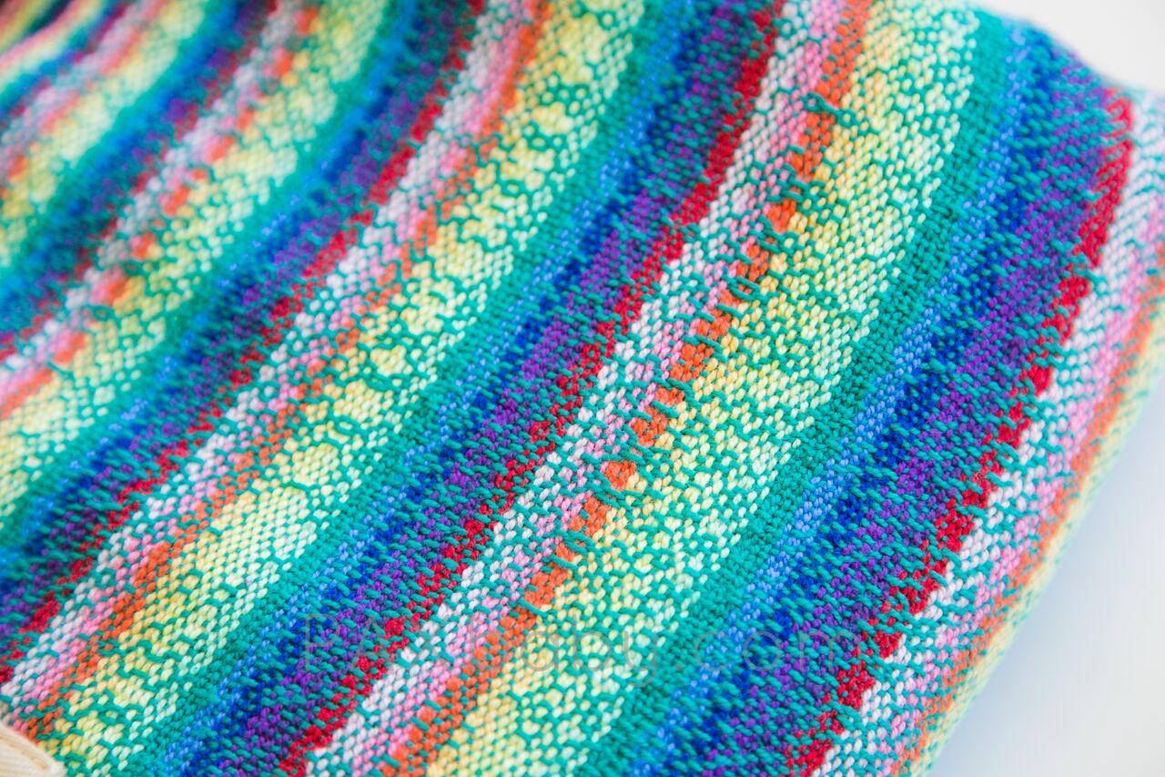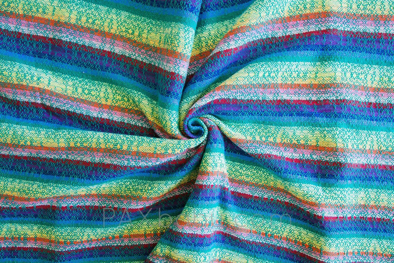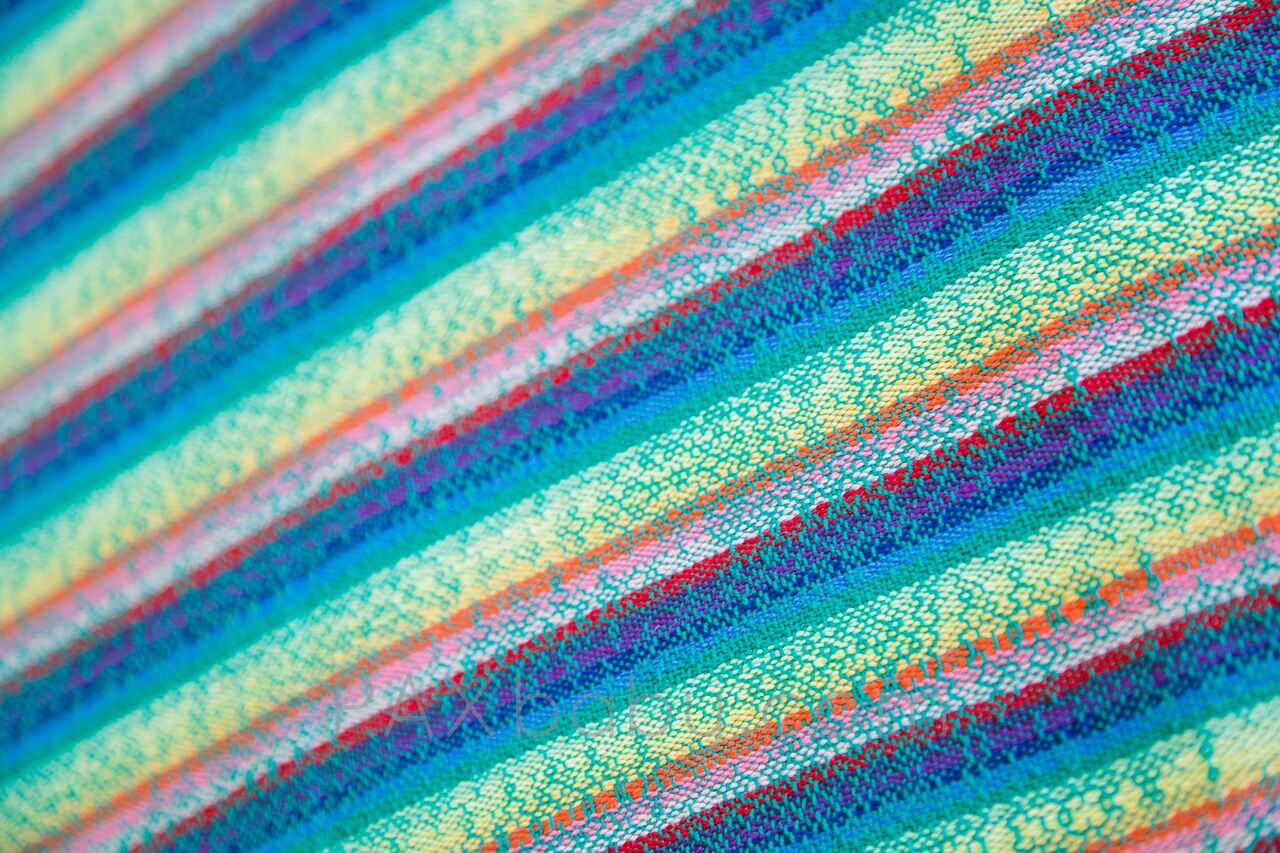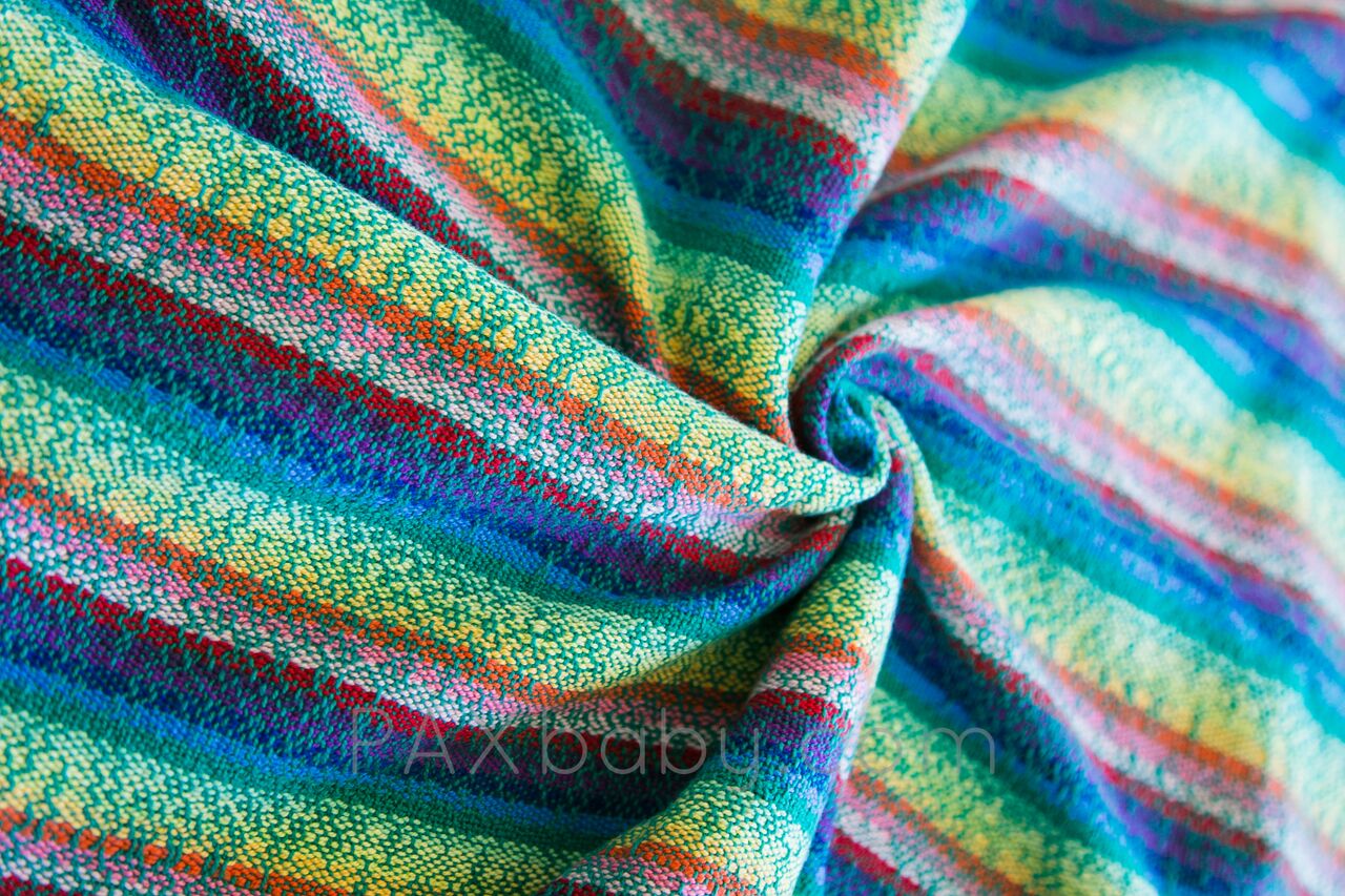 Trailing Rainbows is PAXbaby’s very first exclusive handwoven wrap created by LJ Handwovens! Laura is a color genius, and designed this palette to suit our PAXpersonality! This vibrant warp with a variety of fun wefts woven on her famous pink flower warp gives each wrap an amazing amount of diagonal stretch while maintaining support for the older and heavier baby! Our PAXexclusive LJ Handwoven wrap is named Trailing Rainbows; the pattern starts with a single strand creating a rainbow and slowly increasing throughout the warp creating one rainbow selvedge edge while the other is a solid color which helps the new wrapper be more aware of twisting. Trailing Rainbows is a cotton warp with cotton weft chosen for its ease of care. Wash, dry, and wear! It’s THAT easy!